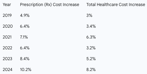 Historically, prescription drug costs have outpaced total healthcare costs. The following chart highlights this trend from 2019 to 2024.
